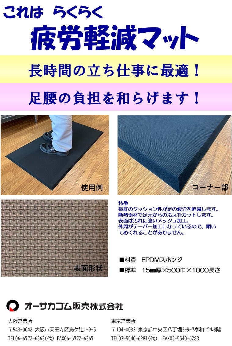 表面(色ゴム)3mm、裏面黒ゴムの積層ゴムマットで、表面に○+の凹凸模様(高さ1.2mm)はそれぞれ15mm間隔で付けてあります。 |